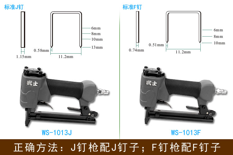 所以,因為“J釘要比F釘寬”,1010J的釘子,只能用在1013J氣釘槍;1010F的釘子,也只能用在1010F或1013F氣釘槍上。我們在購買釘子時,應該是買“J釘配J氣釘槍;F釘配F氣釘槍”,千萬別混用了。