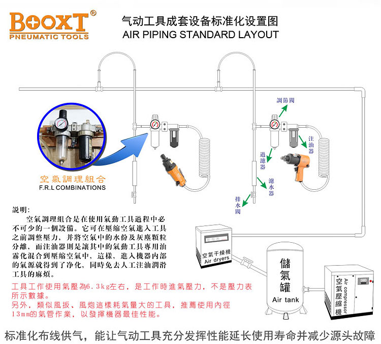 防銹:壓縮空氣,如果按標(biāo)準(zhǔn)布線,雖然在經(jīng)過(guò)機(jī)房的干燥機(jī)、現(xiàn)場(chǎng)終端的空氣調(diào)理組過(guò)濾以后,仍然會(huì)殘存水氣的可能。而大部件的氣動(dòng)工具馬達(dá)由鋼制或鐵制部件構(gòu)成,這些水氣進(jìn)入氣動(dòng)工具馬達(dá)內(nèi)部之后,如果沒(méi)有氣動(dòng)油來(lái)保護(hù)這些部件,不將水氣沖洗出機(jī)器外部,這些部件就極易生銹,從而給機(jī)器造成各種故障。