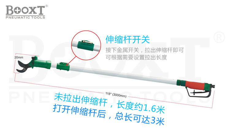 • 產(chǎn)品參數(shù): 剪切能力:25mm;默認(rèn)長(zhǎng)度:1.6米,最長(zhǎng):3米(打開伸縮桿后);桿直徑:30mm,握把直徑:36mm;使用氣壓:6.3kgf/cm;推薦使用氣管:12*8mm;凈重:1.72kg;毛重:2.46kg;耗氣量:0.073L/次
