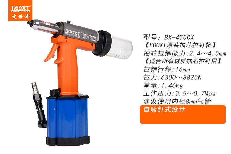 東莞市強(qiáng)勁五金工具有限公司提供臺(tái)灣BOOXT波世特品牌氣動(dòng)工具,自吸釘氣動(dòng)拉鉚槍BX-450CX廠家直銷,首件享特價(jià)。咨詢熱線:4008301980