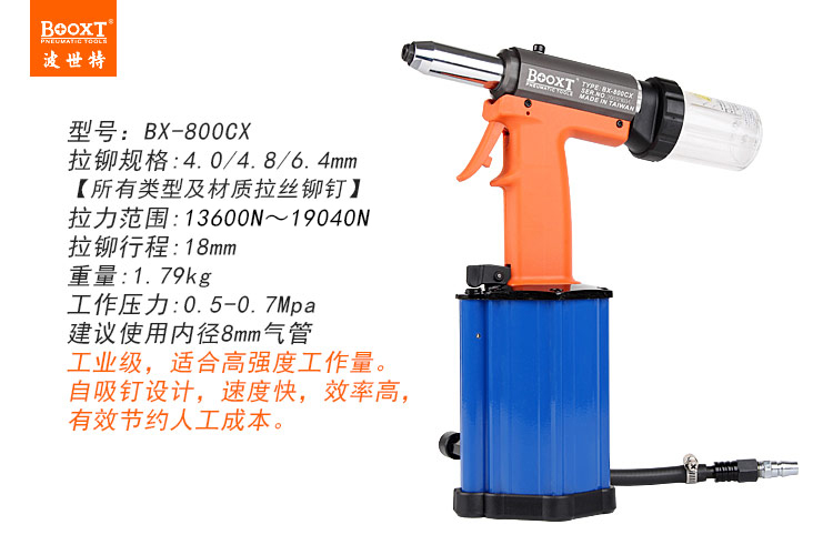 東莞市強(qiáng)勁五金工具有限公司提供臺(tái)灣BOOXT波世特品牌氣動(dòng)工具,氣動(dòng)拉釘槍BX-800CX廠家直銷,首件享特價(jià)。咨詢熱線:4008301980