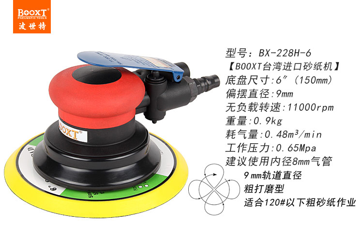• 產(chǎn)品參數(shù): 底盤(pán)尺寸:150mm 空載轉(zhuǎn)速:11000rpm 偏擺直徑:9mm 重 量:0.9kg 耗 氣 量:1.6cfm/min(粗磨)