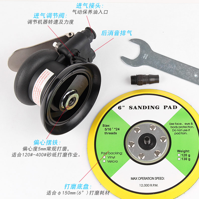 • 產(chǎn)品參數(shù): 底盤尺寸:150mm (6寸) 空載轉(zhuǎn)速:12000rpm 偏擺直徑:5mm 重 量:0.86kg 耗 氣 量:0.48M3/min 噪 音 值:75db (中磨)