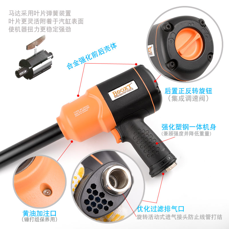 加長軸風(fēng)動(dòng)扳手特點(diǎn):(塑鋼外殼,強(qiáng)度高重量輕,扭力大)