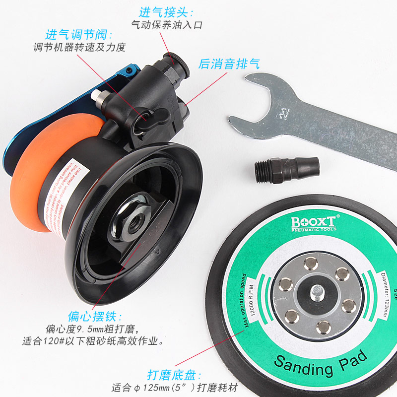 • 產(chǎn)品參數(shù): 底盤尺寸:125mm 空載轉(zhuǎn)速:12000rpm 偏擺直徑:9.5mm 重 量:0.78kg 耗 氣 量:0.48M3/min 噪 音 值:75db(粗磨/無油葉片)