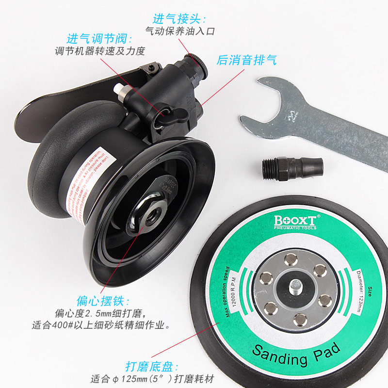 • 產(chǎn)品參數(shù): 底盤尺寸:125mm 【5寸】 空載轉(zhuǎn)速:12000rpm 偏擺直徑:2.5mm 重 量:0.8kg 噪 音 值:78db 耗 氣 量:170L/min 【細(xì)磨】