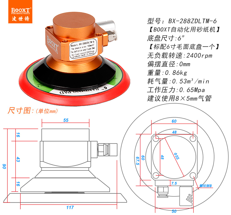 • 產(chǎn)品參數(shù): 底盤尺寸:150mm 【6寸】 偏心尺寸:0mm (同心) 空載轉(zhuǎn)速:2400rpm 重 量:0.86kg 耗 氣 量:0.53m3/min 【同心/慢速】