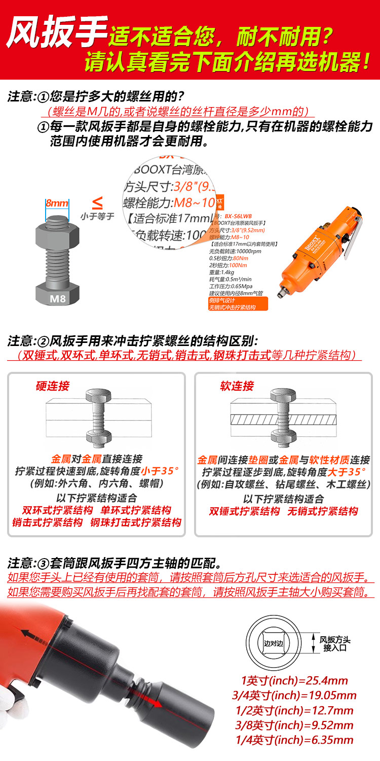 提示:因為不同制造工廠的測試標(biāo)準(zhǔn)不一樣,所測的扭力參數(shù)會相差比較大,另外測試扭力并不是實際螺栓擰緊的扭力(經(jīng)常有客人用這個扭力參數(shù)來選型是錯誤的),建議沖擊式的工具選型請按“螺栓能力”來選,才是專業(yè)的。