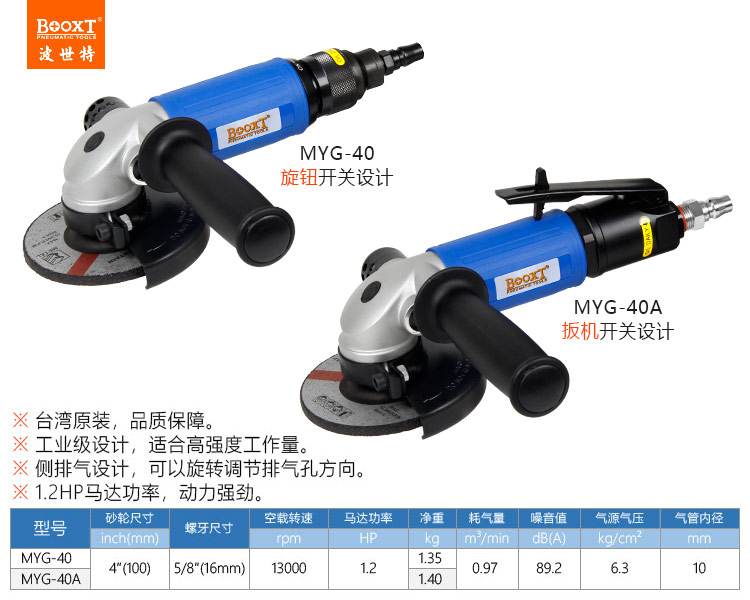東莞市強(qiáng)勁五金工具有限公司提供臺灣BOOXT波世特品牌氣動(dòng)工具,工業(yè)級風(fēng)動(dòng)角磨機(jī)MYG-40A廠家直銷,首件享特價(jià)。咨詢熱線:4008301980