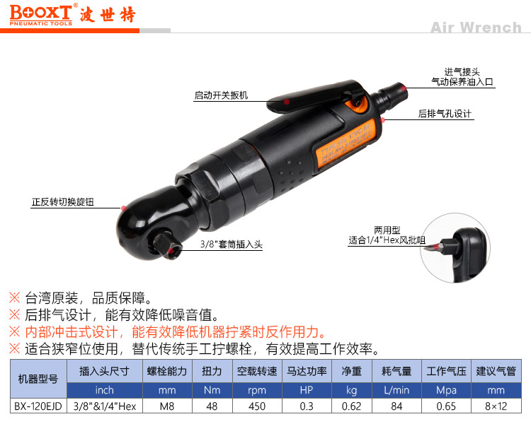 東莞市強勁五金工具有限公司提供臺灣BOOXT波世特品牌氣動工具,兩用氣動棘輪扳手BX-120EJD廠家直銷,首件享特價。咨詢熱線:4008301980