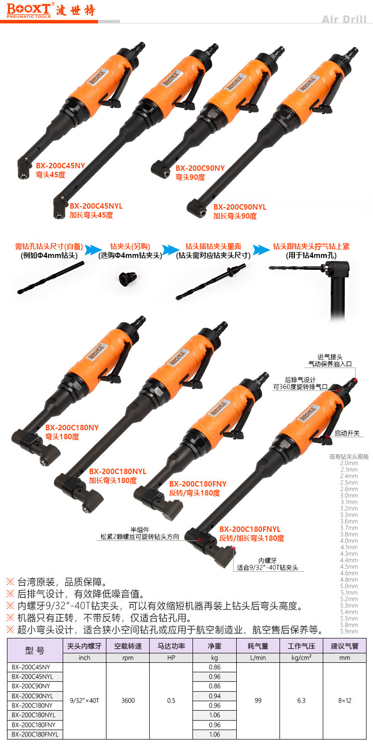 東莞市強(qiáng)勁五金工具有限公司提供臺灣BOOXT波世特品牌氣動工具,彎頭45度氣鉆BX-200C45NY廠家直銷,首件享特價。咨詢熱線:4008301980